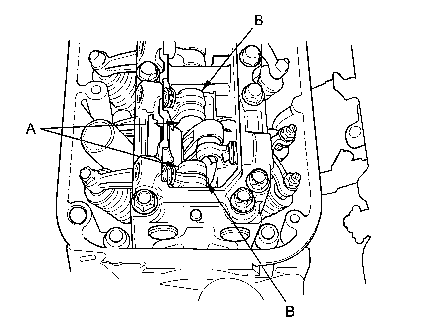 11. With the specified air pressure applied, rotate the crankshaft pulley clockwise, and visually check all the intake primary rocker arms (A) and the intake secondary rocker arms (B) move together.