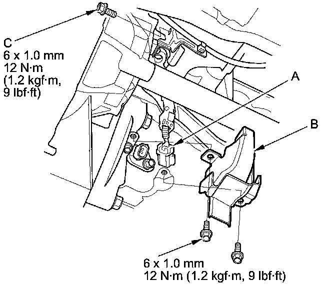7. Connect the CKP sensor connector (A), then install the CKP sensor cover (B) and the bolt (C).
