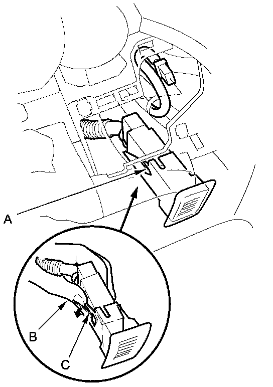 4. Unhook the left lock tab (A) of the humidity/in-car temperature sensor by pushing your thumb (B) between the sensor and tab (C).