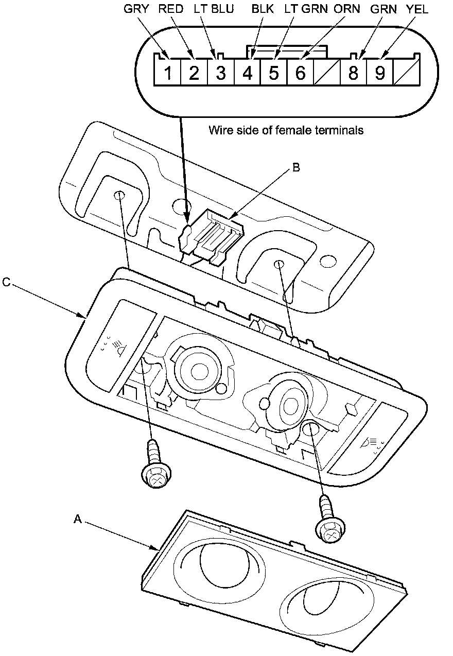 3. Disconnect the 10P connector (B) from the rear individual map light (C).