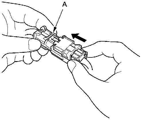 When diagnosis or troubleshooting is done at waterproof SRS connector (A), use the terminal test port above the terminal you need to check. Gently insert the pin probe of the tester or jumper wire at the terminal test port from the terminal side.