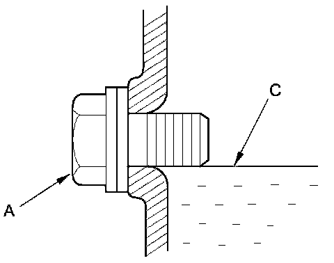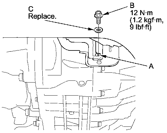 3. Remove the fluid check bolt (A) and the sealing washer (B). Check the condition of the MTF and make sure it is at the proper level (C).