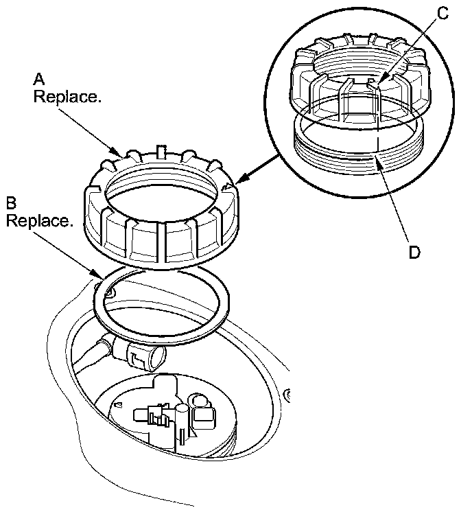 1. Temporarily attach a new base gasket (A) to the fuel tank unit (B), position the mark of the transfer tube (C) up, connect the transfer tube (D), then insert the fuel tank unit partially into the fuel tank.