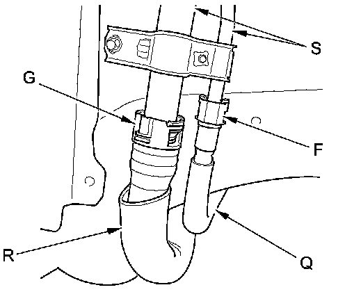 The fuel line/quick-connect fittings (A, B, C, D, E, F, and G) connect the fuel joint hose (H) to the fuel feed hose (I), the fuel feed hose to the fuel line (J), the fuel line (K) to the fuel tank unit (L), the fuel vapor line (M) to the EVAP canister (N), the fuel vent tube (O) to the fuel vent tube B (P) and the fuel tank vapor recirculation tube (Q) and fuel fill neck tube (R) to the fuel fill pipe (S). When removing or installing the fuel feed hose, the fuel tank unit, or the fuel tank, or when disconnecting or connecting the quick-connect fittings, pay attention to the following: