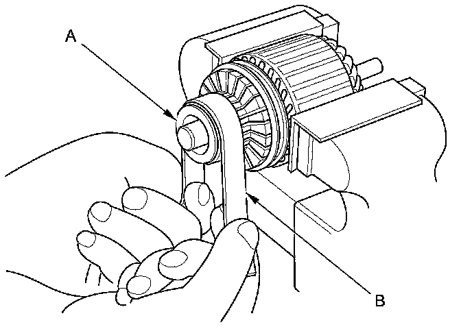6. Check the commutator (A) surface. If the surface is dirty or burnt, resurface it with an emery cloth or a lathe to the specifications in step 7, or recondition with #500 or #600 sandpaper (B).