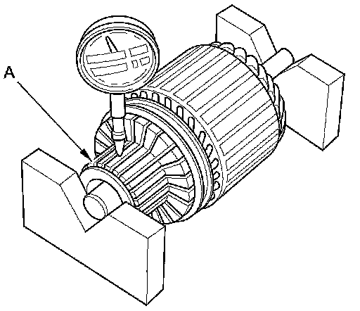 9. Use a digital caliper or dial type caliper to check the mica depth (A). If the mica depth is below the service limit, replace the armature.