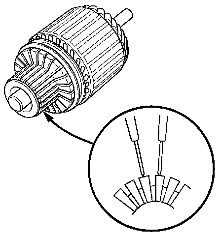 10. Use an ohmmeter to check for continuity between the segments of the commutator. If there is an open circuit between any segments, replace the armature.