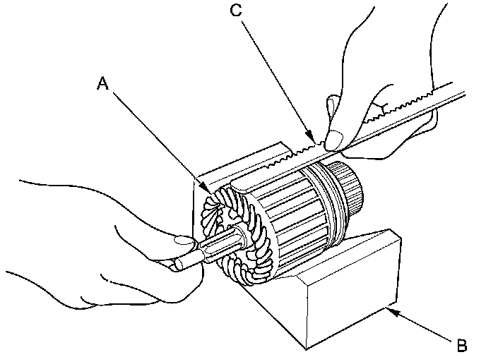 11. Place the armature (A) on an armature tester (B). Hold a hacksaw blade (C) on the armature core. If the blade is attracted to the core while the core is turned, the armature is shorted. Replace the armature.
