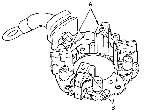 17. Check for continuity between the (1-2) brush holders (A) and the (3-4) brush holders (B). If there is continuity, replace the brush holder assembly.
