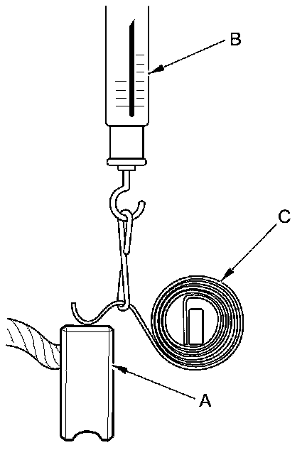 18. Insert the brush (A) into the brush holder, and bring the brush into contact with the commutator, then attach a spring scale (B) to the spring (C). Measure the spring tension at the moment the spring lifts off the brush. If it is not within the standard, replace the brush holder assembly.
