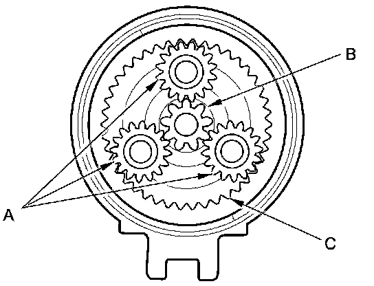 19. Check the planetary gears (A), the armature shaft gear (B), and the internal ring gear (C). Replace them if they are worn or damaged.