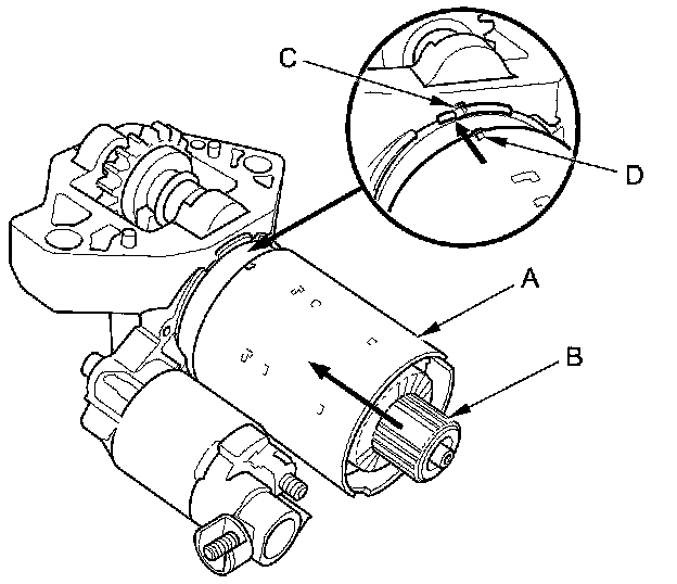 20. Install the armature housing (A) and the armature (B) by aligning the slotted point (C) to the projection (D).