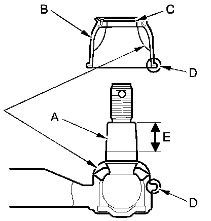 - Keep grease off the boot mounting area (D) and the tapered section (E) of the ball pin.