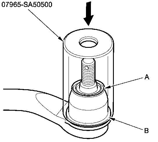 6. Install the ball joint boot (A) using the bearing driver attachment. The boot must not have a gap at the boot installation sections (B). After installing the boot, check the ball pin tapered section for grease contamination, and wipe it if necessary.