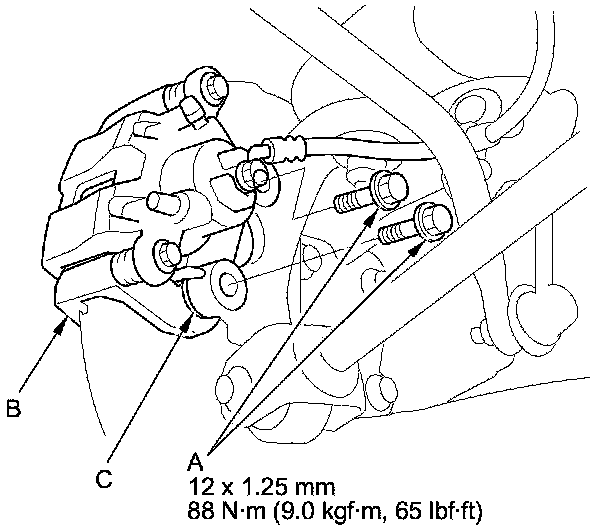 NOTE: Make sure the washers (C) are reinstalled between the brake caliper bracket and the knuckle, if they are removed.