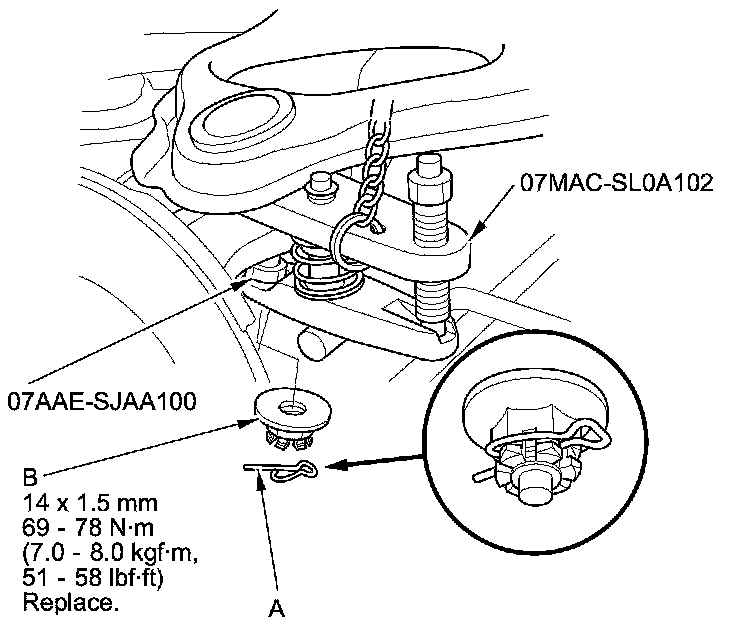 6. Remove the lock pin (A) from the upper arm ball joint, then remove the castle nut (B).