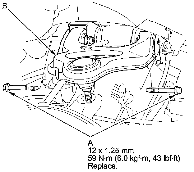 9. Remove the upper arm mounting bolts (A), then remove the upper arm (B).