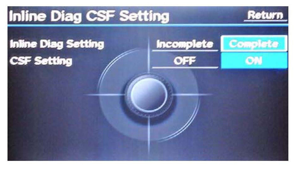 ^ Set the Inline Diag Setting to Complete, and make sure the CSF Setting is ON, then select Return twice to exit the diagnostic mode.