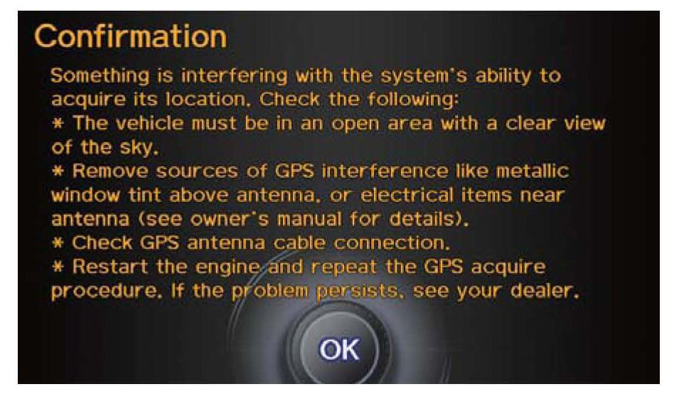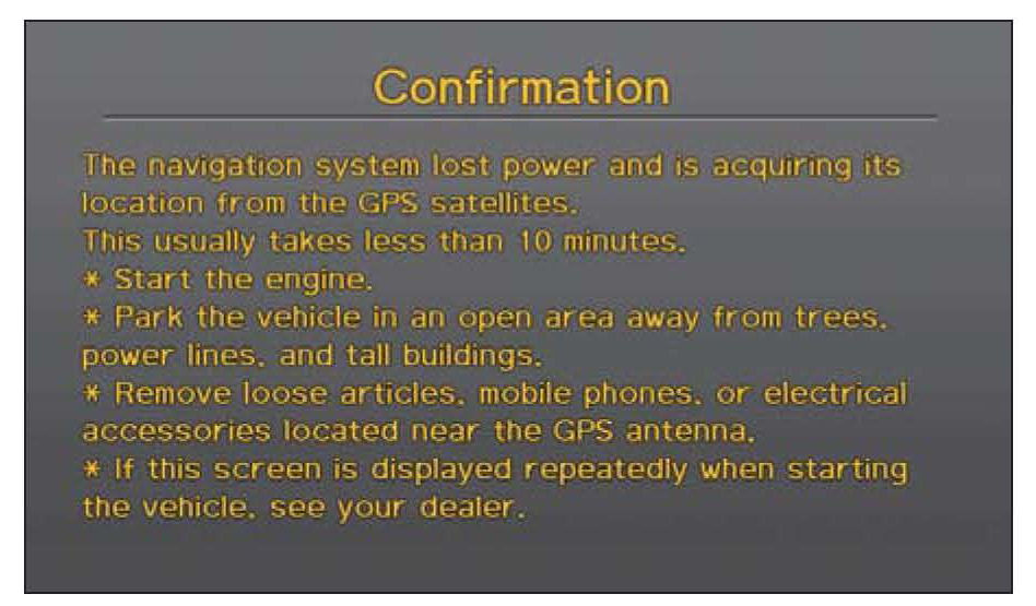 5. If the system does not initialize within 10 minutes, a second screen (shown below) appears. The system is still initializing but will not automatically exit to the globe screen when the initialization is complete. Do not immediately follow the instructions on the screen. After 30 minutes, try restarting the engine to see if the navigation system completed the initialization. If it did not, follow the instructions on the screen.