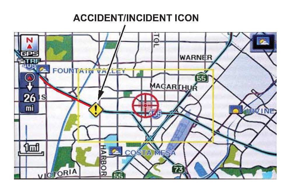 ^ Small diamond-shaped "traffic incident" icons may be shown. If so, scroll over an icon and press in the interface dial to see the details.