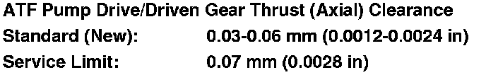 3. Remove the ATF pump driven gear shaft. Measure the thrust clearance between the ATF pump drive gear (A) and the main valve body (B), and between the ATF pump driven gear (C) and the main valve body using a straight edge (D) and a feeler gauge (E).