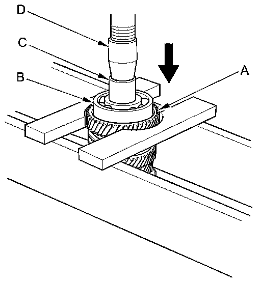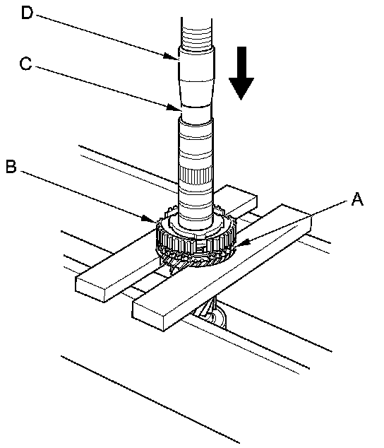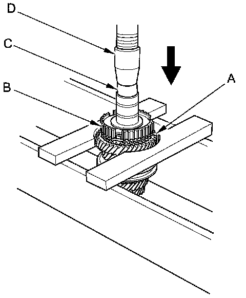 3. Support 3rd gear (A) on steel blocks, and press the mainshaft out of the 3rd/4th synchro hub (B) and 3rd gear using an attachment (C) and a press (D).