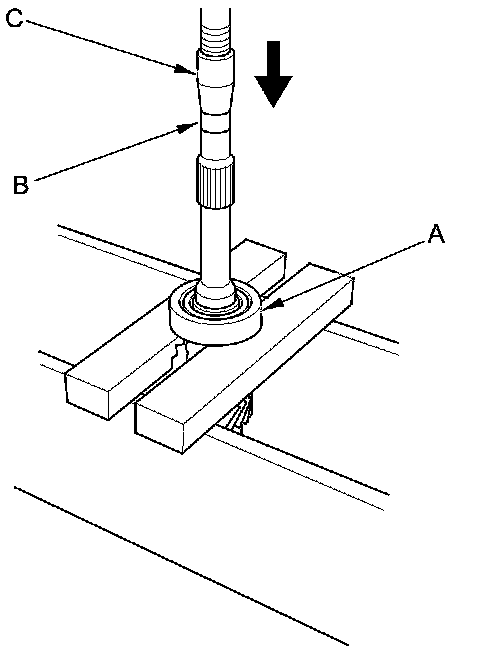 4. Support the angular ball bearing (A) on steel blocks, and press out the mainshaft using an attachment (B) and a press (C).