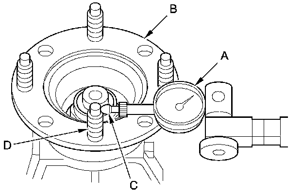 5. Set a dial indicator (A) on the transfer companion flange (B); position the dial indicator tip (C) on the top of the bolt (D).