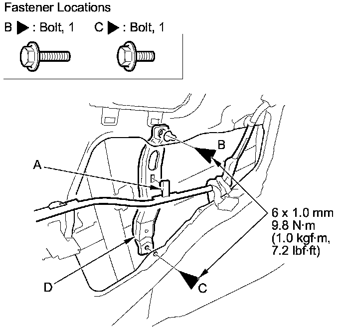 5. Detach the harness clip (A). Loosen the bolt (B), and remove the bolt (C), then remove the door panel bracket (D).
