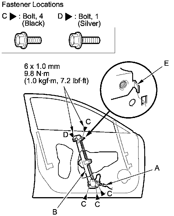 8. Remove the bolts (C), and loosen the bolt (D). Release the hook (E), then remove the regulator through the hole in the door.