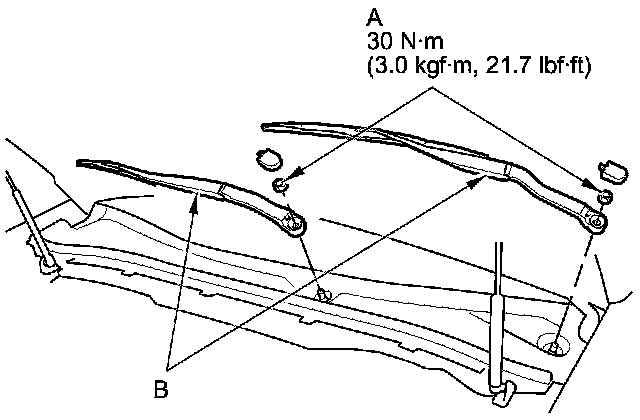 1. Open the hood. Remove the cap, nuts (A), and the windshield wiper arms (B).
