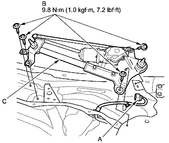 4. Remove the four bolts (B) and the wiper linkage assembly (C).
