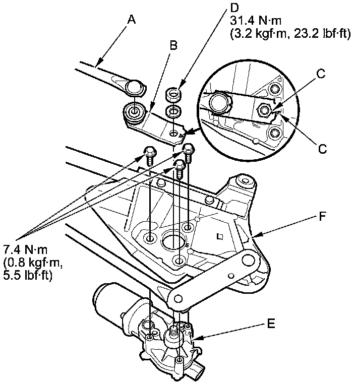 7. Remove the three bolts, and separate the wiper motor from the linkage (F).