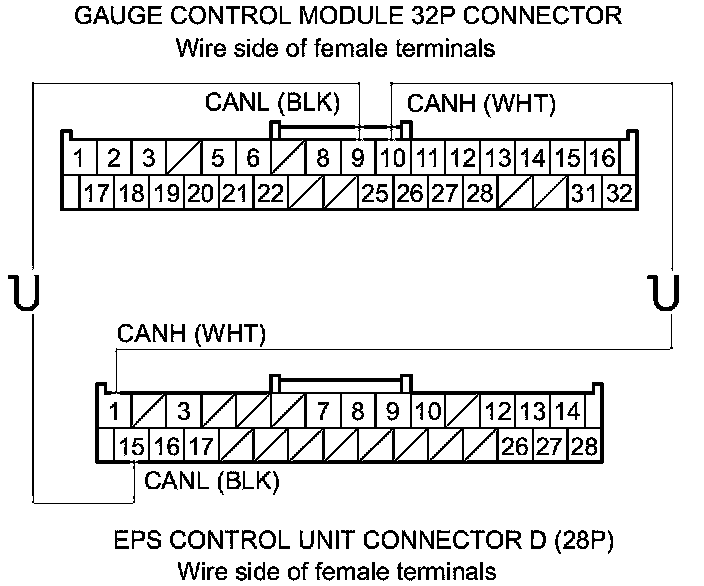 9. Check for continuity between the gauge control module 32P connector terminals No. 9 and No. 10 and EPS control unit connector D (28P) terminals No. 15 and No. 1 respectively.