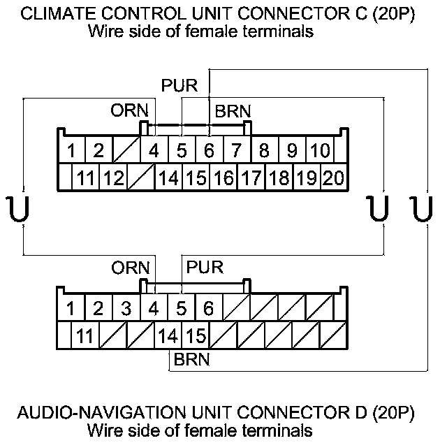 7. Check for continuity between the following terminals of climate control unit connector C (20P) and audio-navigation unit connector D (20P).