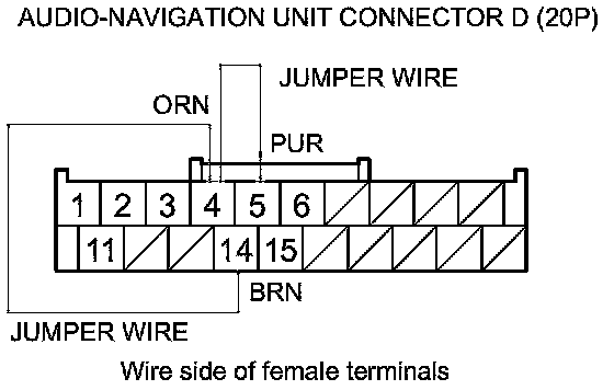 10. Connect audio-navigation unit connector D (20P) terminals No. 4, No. 5, and No. 14 with jumper wires.