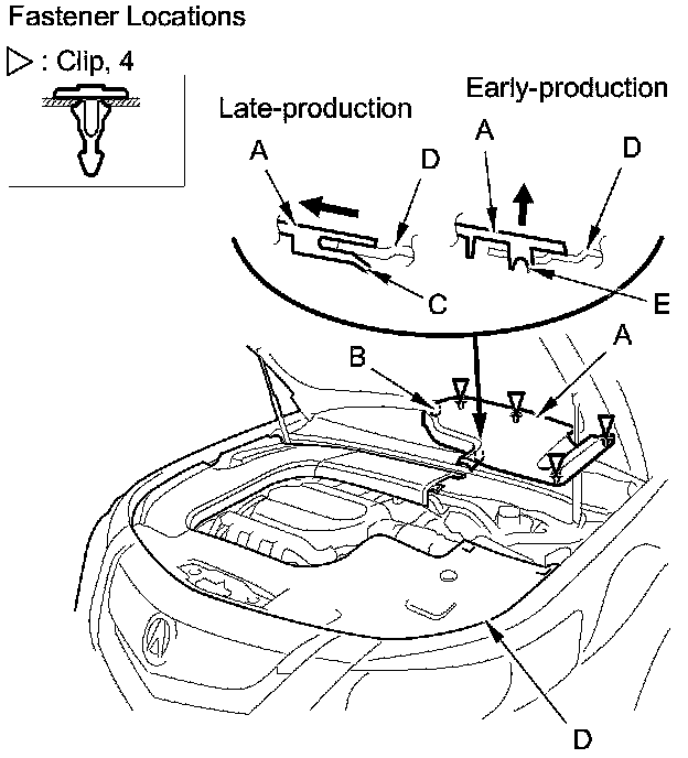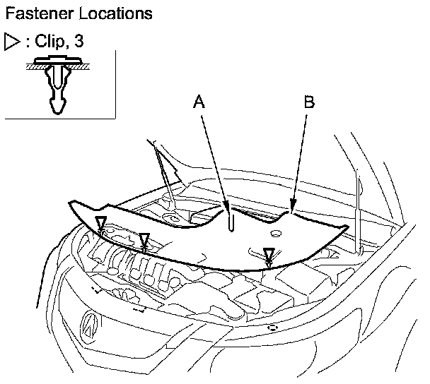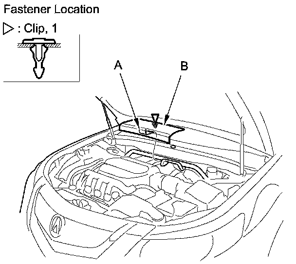 4. Detach the clip, and release the hook (A), then remove the strut brace cover (B).