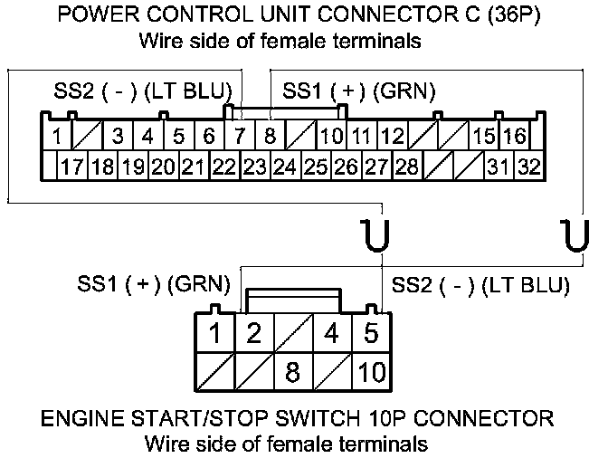 22. Check for continuity between engine start/stop switch 10P connector terminals No. 2 and No. 5, and power control unit connector C (36P) terminals No. 8 and No. 7 respectively.