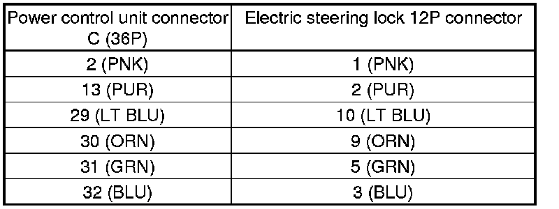 29. Check for continuity between electric steering lock 12P connector terminals and power control unit connector C (36P) terminals as shown.