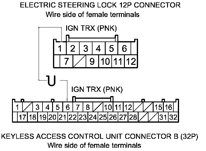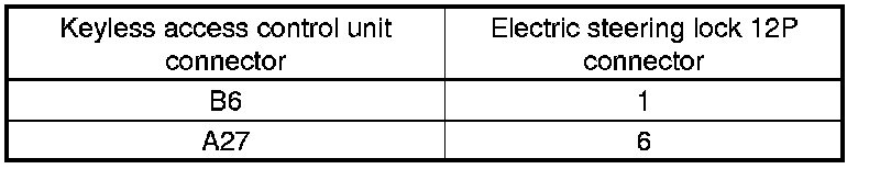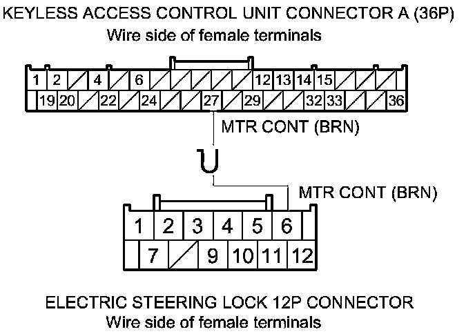 36. Check for continuity between keyless access control unit connector A (36P) and B (32P) terminals and electric steering lock 12P connector terminals as shown.