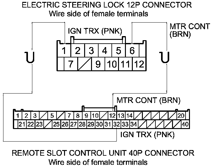 38. Check for continuity between electric steering lock 12P connector terminals No. 1 and No. 6 and remote slot control unit 40P connector terminals No. 32 and No. 12 respectively.