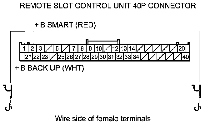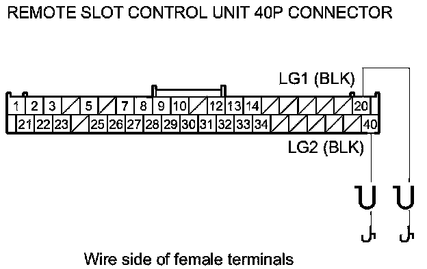 39. Measure the voltage between body ground and remote slot control unit 40P connector terminals No. 1 and No. 2 individually.