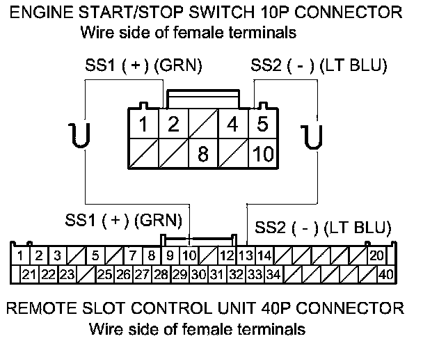 41. Check for continuity between remote slot control unit 40P connector terminals No. 10 and No. 13 and engine start/stop switch 10P connector terminals No. 2 and No. 5 respectively.