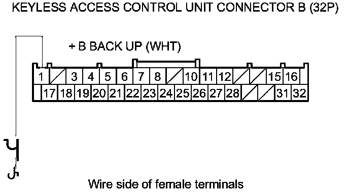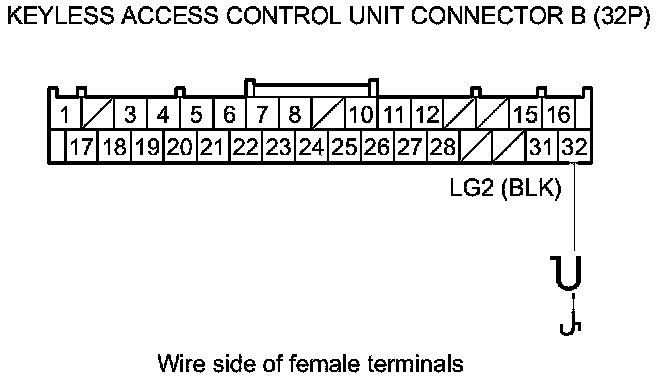 42. Measure the voltage between body ground and keyless access control unit connector B (32P) terminal No. 1.