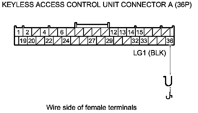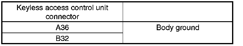 43. Check for continuity between body ground and keyless access control unit connectors A (36P) and B (32P) terminals as shown.