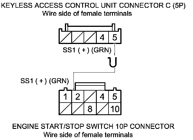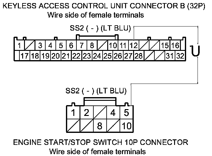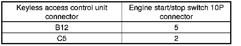 45. Check for continuity between keyless access control unit connectors B (32P) and C (5P) terminals and engine start/stop switch 10P connector terminals as shown.