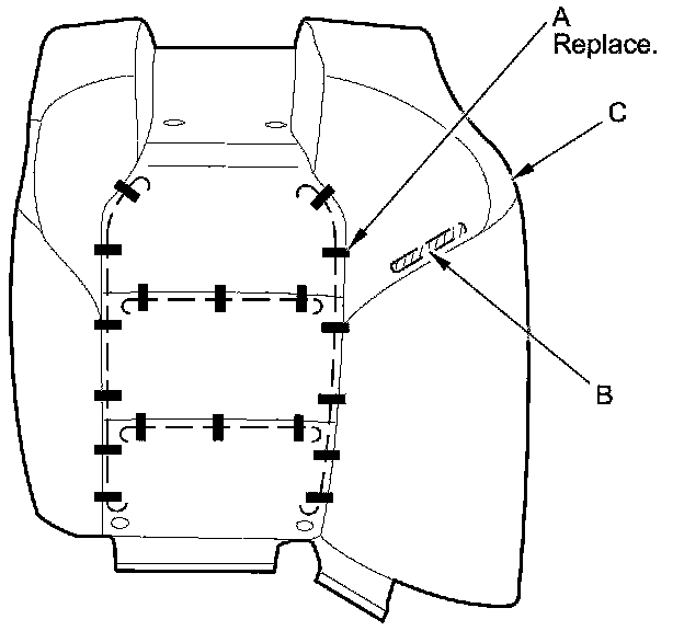 8. Pull back the edge of the seat-back cover all the way around, and release the upholstery rings (A) and Velcro fastener (B), then remove the seat-back cover (C). The left seat-back cover is shown; the right seat-back cover is similar.
