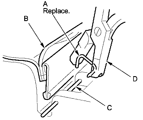 - Replace all of the upholstery rings (A) fastening the seat-back cover (B) to the pad wires (C) with new ones using commercially available upholstery ring pliers (D).