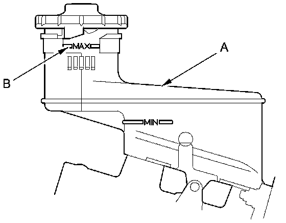 1. Make sure the brake fluid level in the reservoir (A) is at the MAX (upper) level line (B).