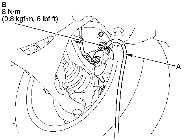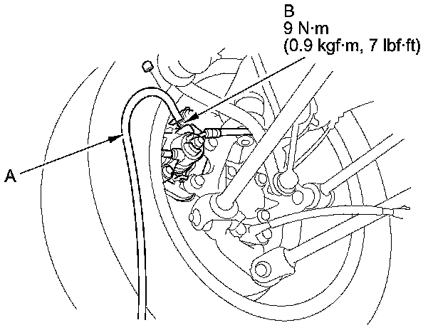 4. Attach a length of clear drain tube (A) to the bleed screw (B), then loosen the bleed screw to allow air to escape from the system. Then tighten the bleed screw securely.